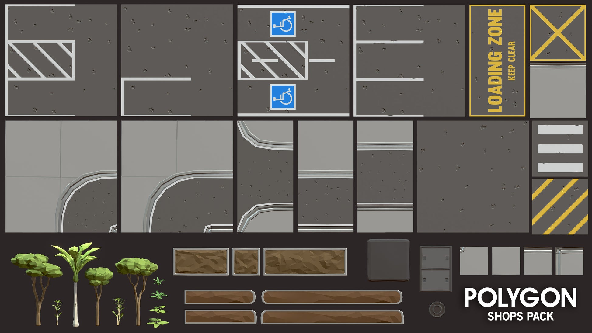 - Roads, Ground Tiles (Car Parks, Loading Zones, Tarmac, Crossings), Dividers, Planters, Plants/Trees, Sidewalks, Ground Blobs, Grasses, etc