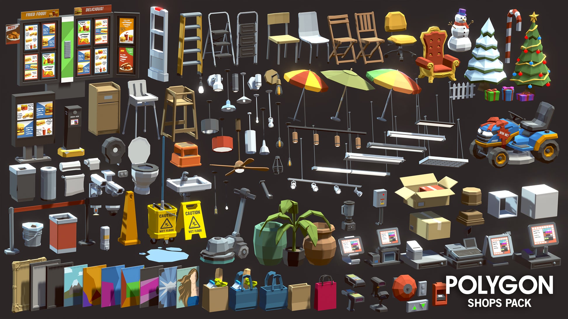 - Air Ducts/Airconditioners, Arcade Machines, Art/Posters, ATM, Bags, Clothing (hanging, folded), Shoes/Boots, Hangers/Racks, Bottles, Cups, Plates, Cutlery, Counters, Cabinets, Bars, Tables, Desks, Shelves, Plinths, Chairs, Stools, Benches, Barber/Salon tools, Lights/Lamps, Pipes, Bollards, Coffee Machine and Accessories, Napkins, Condiments, Parasols, Boxes, Security Cameras, Computers and Peripherals, Laptops, Cameras, TVs, Drive Thru Menus and Speaker, Dumpsters, Flowers and Bouquets, Gym Weights and Racks (Dumbbells, Kettle Bells, Plates), Gym Machines (Treadmill, Cross Trainer, Benches, Leg Press, Pec Deck, Leg Curl, Squat Rack, Spin Bike), Yoga Mats, Swiss Balls, Boxing Bags, Food Carts, Hunting Weapons and Ammo (Pistols, Shotguns, Rifles, Knives), Fishing Rods, Kayak, Tent, Commercial Kitchen Appliances (Fryers, Ovens, Tables/Cabinets, Sinks, Stoves), Kiosks, Mannequins (Male, Female, Heads, Torsos), Supermarket Aisles and Checkouts, Deli/Drink Fridges, Food Cabinets, Freezers, Produce Stands, Fruit Bowl and Basket, Mats, Mirrors, Musical Instruments (Guitars, Drums, Brass, Headphones, Microphone, Flute, Keyboard, Speakers, Turntable), Planter Boxes and Plants, Queue Barriers, Rubbish Bins, Safety Barriers, Cash Registers and Order Machines, Scanners, Security Scanner, Shopping Carts and Baskets, Toilets and Ablutions, Pipes, Fire Alarm and Sprinkler, Sports Equipment (Bats, Rackets, Balls, Boxing Glove, Hats, Helmets, Scooter, Boards), Pallets, Trolleys, Step Ladders, Pallet Jack, Water Puddle, Xmas Scene Props, Scatter Papers, Mower, etc