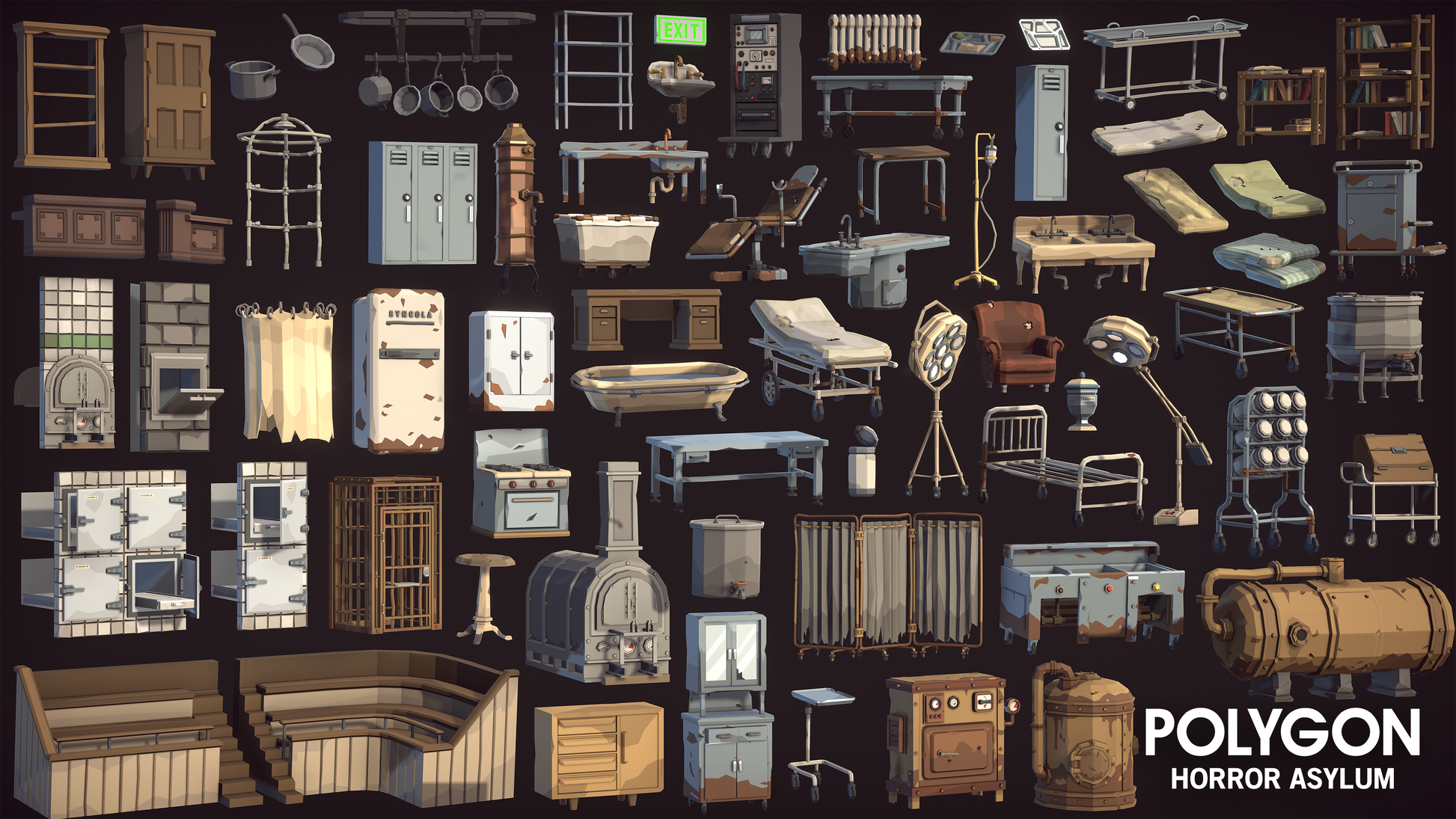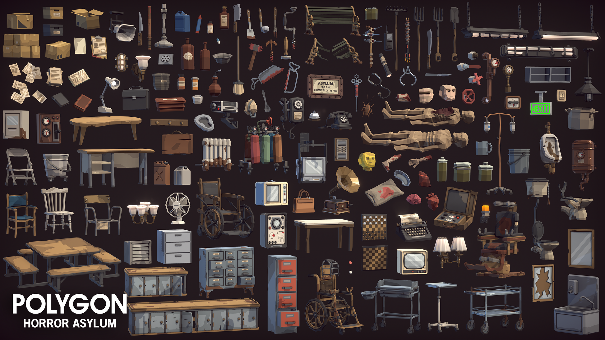 Air Ducts, Baths, Beds, Bedpan, Bell, Benches, Boilers, Books, Bookshelves, Bottles, Bowl, Briefcases, Broom, Buckets, Cabinets, Cadavers, Cage, Calipers, Cardboard Boxes, Cart, Chains, Chairs, Checkers Boards, Chutes, Clipboard, Cockroach, Containers, Cork Screw, Counters, Crayon, Cup, Cupboards, Curtain, Debris Piles, Decals, Deep Fryers, Desks, Drawers, Drill, Fan, Flashlight, Floor Drain, Fountain, Furnaces, Gas Masks, Gas Can, Generator, Glass Shards, Gramophone, Graves, Greebles, Gurneys, Heads, Heaters, Intercom, Jars, Utensils, Lamps, Lights, Limbs, Lockers, Mattresses, Mirror, Monitors, Morgue Fridges, Organs, Oven, Pans, Papers, Pills, Pillow, Pipes, Pitchforks, Pots, Racks, Rake, Refrigerator, Barriers, Rugs, Saws, Scalpel, Security Camera, Shelves, Shock Pad, Shock Machine, Shoes, Signs, Sinks, Siren, Soup Cookers, Spade, Speakers, Stands, Statues, Syringe, Tables, Telephones, Television, Tenderiser, Theatre Seating, Toilets, Trays, Trellis, Trolleys, Typewriter, Urinal, Urns, Walkie Talkie, Wardrobe, Heaters, Wheelchairs, Wires etc.